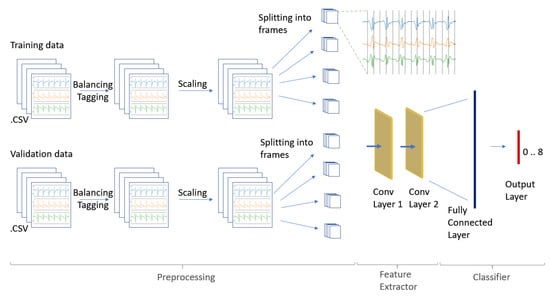 The input data for the model are first scaled, but no additional signal processing is done. The training samples are recorded without idle time between the strokes to retrieve ground truth. For moments where the player is not playing, we added an extra scenario to make sure inherent sensor noise is not classified as stroke. Unlike many other previous studies [], we do not normalize our samples, because, in addition to the learning of the patterns in the signal, magnitudes also possess information for the model to learn. Subsequently, we divide the signals into frames of fixed time duration. Because a large number of badminton strokes involve similar movement patterns, it is important to consider time frames that contain sufficiently large parts of a stroke at once during the classification. This allows for the model to learn to recognize the full course of a specific stroke movement. For each frame, the most common ground truth label is used as the label for the entire frame. We do not use overlapping frames during the training process.