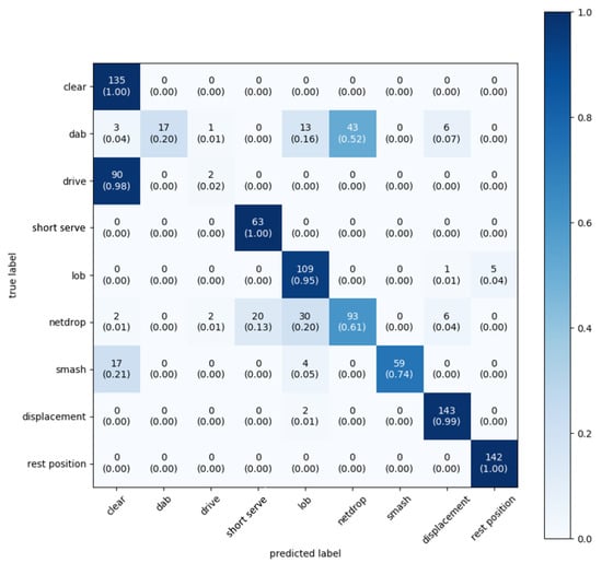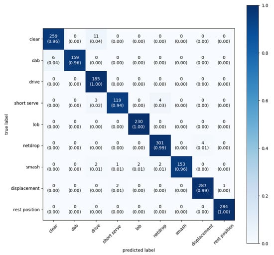 Although we get a large improvement by applying ensemble learning, we noticed, during our experiments, that the largest deviations occur when predicting the clear and the short serve (respectively, the longest and shortest stroke in time). When we make a prediction, we get a probability (Softmax) for all frames f per stroke type i. Per frame, the most likely class is then returned as a result. When we notice that there is confusion between two different classes and we know that one of the two is very likely to be incorrect (e.g., recognizing a short serve with a model based on long framesizes), we can correct this by using weights. These weights are determined according to the average duration of the movements. We increase the weights for a short service on the models with a smaller framesize to further improve the accuracy. Additionally, the weights for a clear on the models with a larger framesize obtain a higher value. As a result of these modifications, we obtain almost perfect results for the same scenario, as shown in Figure 8.
