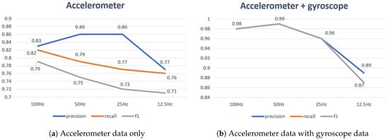 Precision, recall and f1 score measured with (a) accelerometer data only or in (b) combination with gyroscope data at sample frequencies of 100, 50, 25, and 12.5 Hz.
