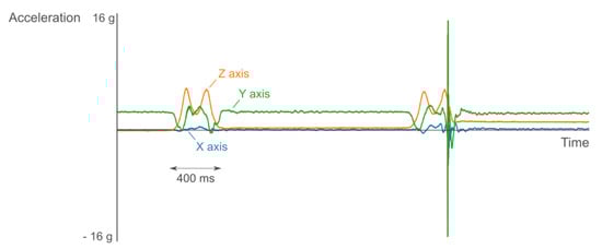 Nevertheless, we still get very good results here. For the wrist, we obtain a weighted average accuracy of 93% at a sampling frequency of 100 Hz. On the upper arm, this is 96% as compared to the achieved 98% at the racket. Only the information measured on the wrist and upper arm shows less detail in the signal. The most detailed information was obtained by attaching the sensor to the bottom of the racket’s grip. The strokes on the two other positions were still distinguishable, but the moment of impact of the shuttle could not be detected. This information can be used to distinguish similar movements. The moment of impact is easy noticeable because of a very short high peak in the signal. These peaks can, for example, easily be found when analyzing the derivative of the signal. The difference between non-hitting and hitting the shuttle can be seen in Figure 6. Here, we show the same stroke twice where only during the second stroke the shuttle is hit. Knowing where this peak occurs during the movement can also help to further distinguish strokes or might be useful when analyzing the stroke movement. This position is also most user friendly, since the player does not have to attach sensors to the body. We conclude that we lose some information when we place the sensor further away from the racket, but these positions are still acceptable for activity recognition tasks. Additionally, we foresee that the support of left-handed players is straightforward as such strokes show similar trends with an inverted y-axis. In this case, the y-axis could be inverted before using the model, or the model could be further trained with using y-axis inverted data augmentation data and/or with data from left-handed players.