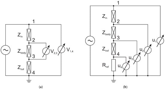 Comparison of the commonly applied techniques and our proposed BIS measurement technique: (a) The common BIS measurement principle, where and symbolise the contact impedance corresponding to the electrode and measured object ; can be calculated using the measured voltages ( in case of two-electrode, or in case of four-electrode techniques) only for current generator. (b) The BIS measurement principle, where and symbolise the contact impedance corresponding to the electrode and measured object ; can be calculated using the measured potentials (, , , ) for both current or voltage generators.