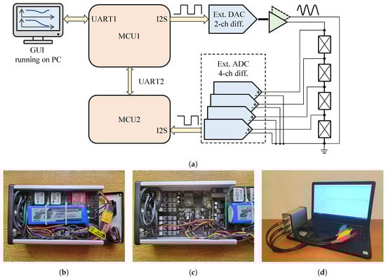 The BIS system (measuring software, measuring device, measuring cable, preamplifiers): (a) Block diagram of bio-impedance spectrum (BIS) measuring instrument; (b) The realized measuring system (power supply); (c) The realized measuring system (measuring board); and (d) Complete measuring system for impedance spectrum measurement.