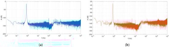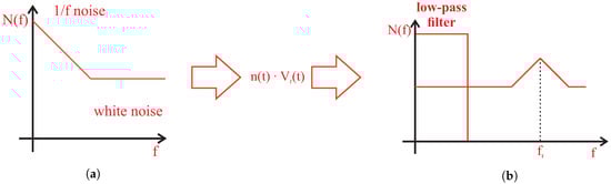 For both of the and components, the incoming noise spectrum is shifted in the frequency (modulated) by the reference signal in the frequency band. Therefore, we receive two-sided band modulated noise (Figure 4) around the reference frequency (therefore, the noise with 1/f characteristics is removed in the low-frequency range and the filter can cut it out better). Depending on its slope, the low-pass filter cuts out the low-frequency part of the noise and the noise component remaining after filtering loses its white-noise properties [37].