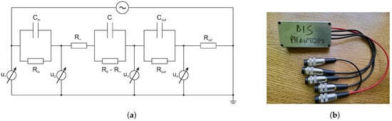 To validate the self-developed BIS system and the data acquisition process, we constructed a BIS phantom (Figure 5b), based on the publication of Fu and Freeman [12]. Our main goal in designing the phantom was to measure the -dispersion with high accuracy at ultra-low frequencies. The phantom (shown in Figure 5a) is a passive electric circuit which produces a typical ultra-low frequency bio-impedance spectrum.