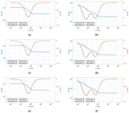 The spectra that consisted of the highest number of frequency points in this validation procedure (i.e., 264 points), had similar relative error values: max() = for and max() = for Z. The comparison of the measured and calculated spectra is shown in Figure 7e,f.