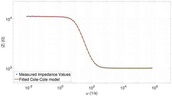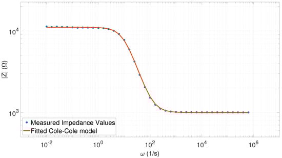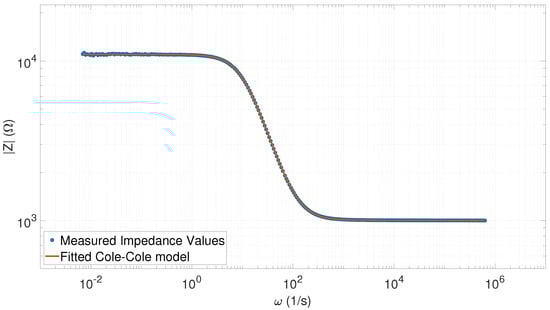 Fitted Cole–Cole model with the measured impedance spectrum values (40 points) corresponding to the value (, , = 11,107, and ).