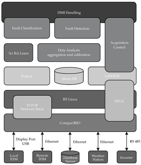 Figure 5 shows the software stack, including the bottom level hardware modules, which implement the interfaces to the real-world, already described in the previous section. The Acquisition Control module coordinates the cyclical process from reading to storing. The LabVIEW synthesized programmable logic running in FPGA guarantees the real-time execution and synchronization of the sampled signals at 25 kHz. The RS485 Modbus communication with the power inverter, and the Ethernet connection to the weather station, are implemented as sub-Virtual Instruments (function) in LabVIEW environment and run at 1s period.