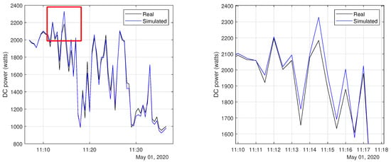 Comparison between simulated and real DC power output when the same irradiance (G) and temperature (T) pairs are used.