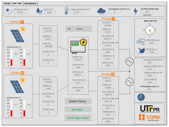 Finally, this section describes the implemented system that collects all of the data to make them available in an execution environment to run the fault detection and fault classification algorithms. The calculated results are indicated as the current status of the PV plant. Figure 14 shows one of the HMI screens, namely the real-time tab, in which all instantaneous and integrated monitored signals, both electrical and environmental, can be viewed together with the system inferred status. The data disposition follows the generation on the PV strings in the left, the inverter and its parameter in the center, and the output of two phases at the right. The upper and right hand strips show the environmental conditions and performance. In this tab, pre-built and user configurable alarms can also be set. The HMI also implements a performance evaluation tab and a history tab, in which a configurable graph of the chosen signals can be plotted in a chosen time window. Because the system is a test bench for monitoring strategies, further details are reported in other work [8].