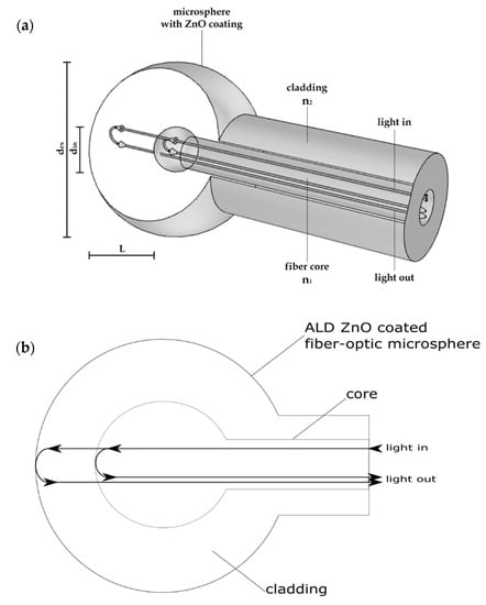Principle of operation of the microsphere-based sensor with ZnO Atomic Layer Deposition (ALD) coating for temperature measurement: (a) schematic representation of a sensor, (b) cross-section of the sensor head.