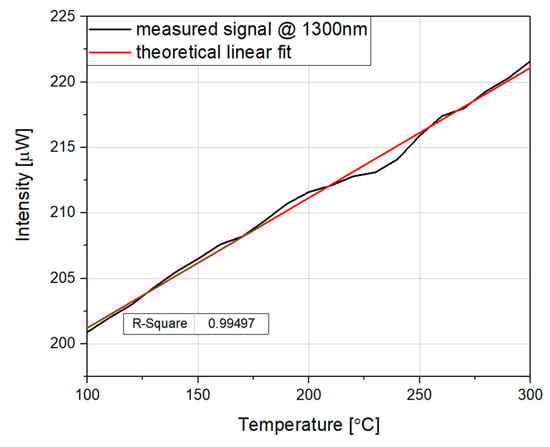 The temperature dependence of the reflected signal peak intensity measured in the entire temperature range is presented in Figure 5. Additionally, Figure 5 shows a theoretical linear fit indicating the accuracy of the device. As shown, the intensity of the reflected signal increased linearly with the temperature. The obtained coefficient R2, which represents the quality of the fit, is 0.995, i.e., close to 1, suggesting good agreement of the experimental data and theoretical linear fit.