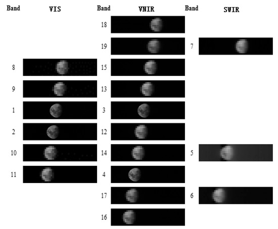 Figure 3 shows the SV moon images of the MERSI solar reflectance bands. The images are aligned based on their positions on the Focal Plane Assemblies (FPAs). Although the samples of the SV image for the 250-m and 1000-m resolution bands are different, their observation angle is the same, and all bands images are converted to the same size as is shown in the figure. In particular, MERSI groups its RSBs on three FPAs, which contain the visible (VIS, 0.412–0.555 μm) bands, the visible and near-infrared (VNIR, 0.65–1.03 μm) bands, and the short-wave infrared (SWIR, 1.38–2.14 μm) bands in Figure 4. VIS FPA comprises bands 8, 9, 1, 2, 10, and 11; VNIR FPA comprises bands 18, 19, 15, 13, 3, 12, 14, 4, 17, and 16; and SWIR FPA comprises bands 7, 5, and 6. When the 45° scanning mirror is rotated, the incident optical line scans the detector array consecutively according to the detector array position, and all bands simultaneously record the DN. Therefore, the moon appears at different positions for the SV images of different bands.