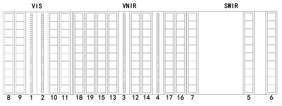 MERSI focal plane assemblies (FPAs). The visible (VIS) FPA comprises bands 8, 9, 1, 2, 10, and 11; the visible and near-infrared (VNIR) FPA comprises bands 18, 19, 15, 13, 3, 12, 14, 4, 17, and 16; and the short-wave infrared (SWIR) FPA comprises bands 7, 5, and 6.