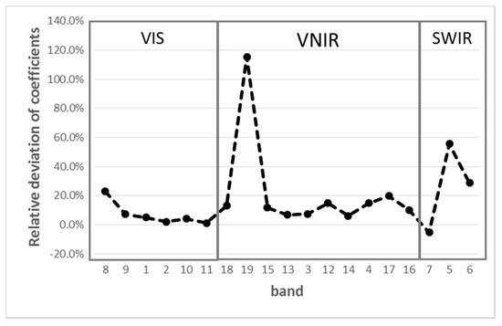 Relative differences of coefficients (classified based on FPA). X-axis is the MERSI band number, and Y-axis is the relative differences of coefficients, which ranges from −20% to 140%.
