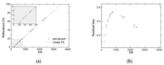 The pre-launch calibration was fitted based on the whole dynamic measurements in Figure 8a. The calibration coefficient is the slope of the linear regression drawn in red line. The real measured data during the pre-launch phase depart from the regression line, especially when the DN is smaller than 400. The residual bias in Figure 8b shows the clear nonlinear distributed pattern with the variation of the DN number.