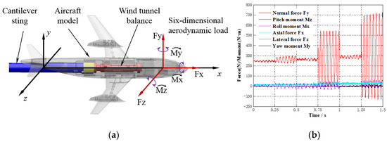In the wind tunnel test, an aircraft model is fixed by a long cantilever support composed of wind tunnel balance and the cantilever sting. The six-dimensional aerodynamic load in the Cartesian coordinate system is shown in Figure 1a, where the axis of the aircraft model is defined as the x-axis, the direction points to the nose of aircraft model, and the aerodynamic load component on the x-axis is the axial force Fx. The vertical axis in the pitch plane of the aircraft model is defined as the y-axis, and the aerodynamic load component on the y-axis is the normal force Fy. The z-axis is determined according to the right-hand rule, and the aerodynamic load component on the z-axis is the lateral force Fz. The moment components of the aerodynamic load on each axis are the roll moment Mx, the yaw moment My, and the pitch moment Mz. Under extreme test conditions with high attack angles, the disturbances in complex unstable airflow lead to large-amplitude reciprocating fluctuation relative to the stable force or moment, resulting in poor quality aerodynamic load data, or aerodynamic load sensor overload. As shown in Figure 1b, vibration mainly occurs in five of the six dimensions, excluding the rolling dimension [4]. To provide feedback for active vibration control, this paper conducts full-dimensional monitoring for serious multidimensional vibration.