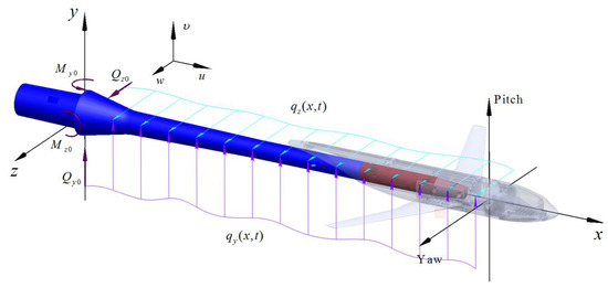 As shown in Figure 2, the long cantilever system, composed of an aircraft model, wind tunnel balance, and the cantilever sting, is simplified as a Bernoulli beam, according to Euler Bernoulli beam theory. Then, the vibration characteristics are analyzed using Hamilton’s principle. Based on force decomposition, the external stochastic aerodynamic load is respectively simplified into distributed load. The distributed load is distributed on the y-axis, and the distributed load is distributed on the z-axis. The concentrated forces of the fixed support end are defined as and , and the concentrated couples are and . Generally, the cross-section’s main direction of the long cantilever structure changes with the axial direction, and the axis of the long cantilever structure no longer remains in the same plane during vibration. For each main vibration, there are two components in the planes perpendicular to each other, that is, the main vibration is coupled with two transverse vibrations.