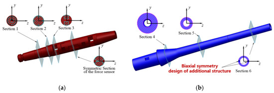 The vibrations described by two vibration differential equations are mutually coupled, with the coupling terms being and . The only way to decouple these is to make . As shown in Figure 3a, the wind tunnel balance section is symmetrical, regarding the y-axis and z-axis. To extend the biaxial symmetry, all the additional cantilever sting structures should be biaxially symmetrical, as shown in Figure 3b, to keep the direction of the main inertial axis of the cross-section unchanging with the x-axis. Therefore, a biaxial symmetry design principle is presented for the cantilever sting to keep .