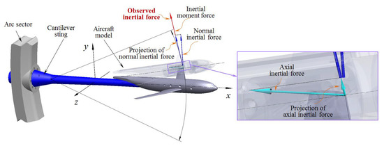 Based on inertial force theory, the fluctuation value of multidimensional aerodynamic force or moment is essentially the inertial force or moment of the aircraft model induced by the disturbances of complex unstable airflow. According to Section 3, unpredictable multidimensional vibration can be decoupled in the pitch plane and yaw plane. Figure 4 shows the vibration in the pitch plane.