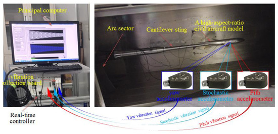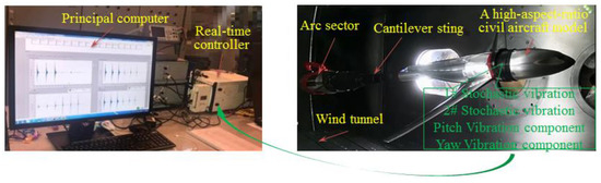 The research object was a high-aspect-ratio civil aircraft model supported by a long cantilever support system composed of wind tunnel balance, a cantilever sting, and an arc sector. The real-time monitoring system of the stochastic multidimensional vibration is illustrated in Figure 5.