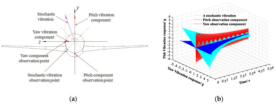 As shown in Figure 6a, a stochastic vibration observation point not in the pitch or yaw plane was selected, and the aircraft model’s stochastic vibration was monitored by an IEPE single-dimensional accelerometer. Two IEPE single-dimensional accelerometers were, respectively, set at the pitch component observation point and the yaw component observation point. The vibration mode frequencies included in the vibration were concentrated in the frequency range of tens to dozens of Hz, while the hammering method excited at least 0–400 Hz as a response of the system, thereby fully covering the frequency range of the system and fully reflecting the system characteristics. Hammering was used to simulate the broadband disturbances of complex unstable airflow.