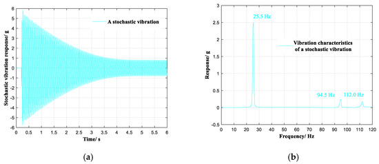 The selected stochastic vibration at the observation point is shown in Figure 7a, and analysis in the frequency domain is illustrated in Figure 7b. In the frequency region of 0~120 Hz, the selected stochastic vibration contained three vibration modes of 25.5 Hz, 94.5 Hz, and 112.0 Hz.