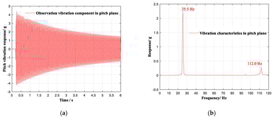 The vibration component of the selected stochastic vibration in the pitch plane is shown in Figure 8a, and the analysis in the frequency domain is shown in Figure 8. In the frequency region of 0~120 Hz, the vibration component contained two vibration modes of 25.5 Hz and 112.0 Hz.