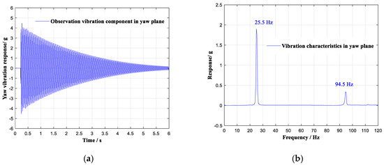 The vibration component of the selected stochastic vibration in the yaw plane is shown in Figure 9a, and the analysis in the frequency domain is shown in Figure 9. In the frequency region of 0~120 Hz, the vibration component contained two vibration modes of 25.5 Hz and 94.5 Hz.
