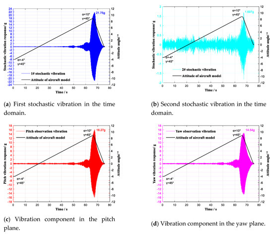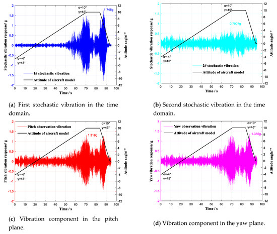 The selected stochastic vibration and its vibration components in the pitch plane and yaw plane, respectively, were simultaneously monitored by the three accelerometers. These results are shown in Figure 6b.