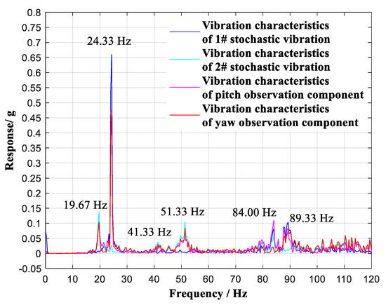In the frequency region of 0~120 Hz, six vibration modes of 19.67 Hz, 24.33 Hz, 41.33 Hz, 51.33 Hz, 84.00 Hz, and 89.33 Hz were identified as contrasting modes. The first stochastic vibration contained three vibration modes of 24.33 Hz, 84.00 Hz, and 89.33 Hz. The second stochastic vibration contained five vibration modes of 19.67 Hz, 24.33 Hz, 41.33 Hz, 51.33 Hz, and 84.00 Hz. Through the vibration component in the pitch plane, five vibration modes of 19.67 Hz, 24.33 Hz, 41.33 Hz, 51.33 Hz, and 89.33 Hz were observed. Through the vibration component in the yaw plane, six vibration modes of 19.67 Hz, 24.33 Hz, 41.33 Hz, 51.33 Hz, 84.00 Hz, and 89.33 Hz were observed; these are listed in Table 3. The vibration characteristics of the two selected stochastic vibrations were therefore observed to be decoupled through the vibration components in the pitch and yaw planes.