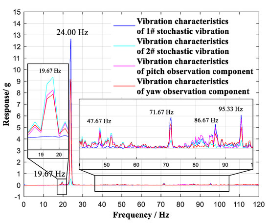 In the frequency region of 0~120 Hz, six vibration modes of 19.67 Hz, 24.00 Hz, 47.67 Hz, 71.67 Hz, 86.67 Hz, and 95.33 Hz were identified as contrasting modes. The first stochastic vibration contained five vibration modes of 24.00 Hz, 47.67 Hz, 71.67 Hz, 86.67 Hz, and 95.33 Hz. The second stochastic vibration contained five vibration modes of 19.67 Hz, 24.00 Hz, 47.67 Hz, 71.67 Hz, and 95.33 Hz. Through the vibration component in the pitch plane, six vibration modes of 19.67 Hz, 24.00 Hz, 47.67 Hz, 71.67 Hz, 86.67 Hz, and 95.33 Hz were observed. Through the vibration component in the yaw plane, six vibration modes of 19.67 Hz, 24.00 Hz, 47.67 Hz, 71.67 Hz, 86.67 Hz, and 95.33 Hz were observed; these are listed in Table 4. The vibration characteristics of the two selected stochastic vibrations were therefore observed to be decoupled through the vibration components in the pitch plane and the yaw plane.