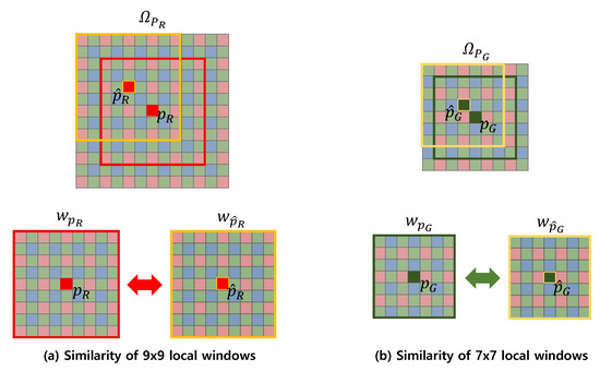 for Equations (2) and (3), respectively, where denotes a Gaussian function with standard deviation . The nonlocal weight measures the similarity of the data structure of and , where and are the pixels that belong to the same color; however, even though measures the similarity between pixels of the same color, all the RGB pixels are involved in the computation of the similarity. For example, even though is the position of the pixel belonging to the Green color, are the pixel positions of all colors. This is in contrast with (1)–(3), where we used only the pixels corresponding to a specific color. The incorporation of all the RGB pixels provides the computation of the similarity with interchannel information. This enhances the accuracy in computing the weighting functions. As a different weighting function results in a different local polynomial approximation function, interchannel information results in a better polynomial approximation. The size of the window that contains the pixels involved in the computation is for the computation of and for the computation of and , as shown in Figure 2. Normally, after obtaining all the local polynomial approximation functions corresponding to all colors and all pixels , we already can obtain the denoised CFA image. This can be done by evaluating the values of all the functions at the points where the functions have been constructed, i.e., evaluate the values for all . By integrating all the values into a 2-D image, we obtain the denoised CFA image; however, with the proposed method, we take one more step to eliminate the effect of the data points that contribute little to the reconstruction of the function values . This can be done by first utilizing the theorem that the can be expressed as a dot product between the filter weights and the data points [35]. Applying the theorem to our case, we can rewrite the function values , , and as