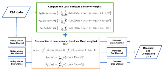 Moving least squares refers to the method of reconstructing a continuous function from a set of unorganized point samples by calculating a weighted least squares measure around the point at which the reconstruction is required. The solution of the MLS method has a closed-form and is easily computed by solving a linear system. It was shown to be quite useful in interpolation-based image-processing such as super-resolution and image zooming [27,28,29]. The MLS method has been applied to 2-D linear and nonlinear systems [30] for the interpolation in meshless environments [31] and for other image processing tasks such as nonlinear color transfer [32], but not to the problem of denoising the CFA image, since one of the major drawbacks of the MLS method is that it is weak against the noise. To overcome the problem of weakness against noise, in [33], we proposed the incorporation of the total variation regularization [34] into the MLS framework for better denoising power; however, if the MLS formulation in [33] is directly applied to the joint demosaicing and denoising problem, it yields poor results, as the correlation between the color channels cannot be well measured because two-thirds of the data are missing and the positions of the missing data are different for each color channel. Therefore, to apply the MLS method to denoise the color filter array, the formulation has to be changed to fit the problem and the weights have to be calculated while taking the interchannel information into account.