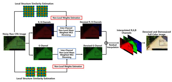 Finally, we replace all the intensity values in in the noisy CFA with , where is the domain corresponding to the CFA image. Here, refers to the pixel position corresponding to the color C. With the denoised CFA , we are now ready to apply the residual interpolation algorithm [4] to obtain the full-color image, i.e., the three-channel array , where is the full-color pixel reconstructed by the demosaicing method. Figure 3 shows the block diagram of the proposed joint denoising and demosaicing method, while Figure 4 shows how the input image is processed by the proposed method and also shows the intermediate image results at each stage.