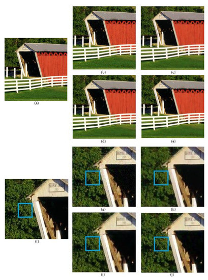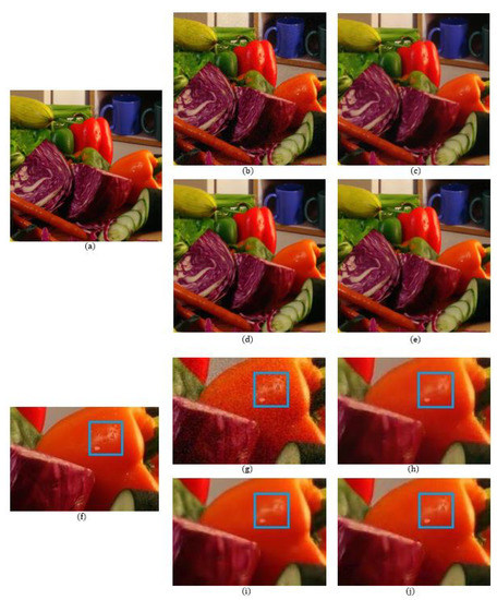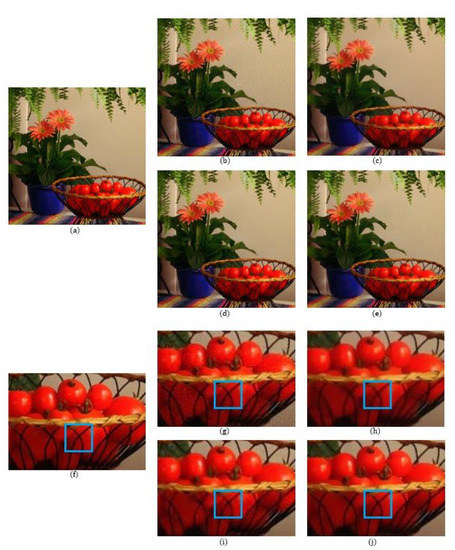 The number of data points used in the reconstructions of the local polynomial approximation functions in the Green channel is 41, where the data are extracted from a window. For the Red and the Blue channels, the number of data points is 49 for each channel, which is extracted from a region. The degree of polynomials and the width of the Gaussian for the Green channel are 3 and 0.3, respectively, while for the Red and Blue channels, the degree of polynomials and the width of the Gaussian are both 3 and 0.5, respectively. Figure 5 shows a comparison of the denoising results on the MCM 9 image with weak noise ( = 7.65). We see that even though the BM3D method has the highest PSNR value, there are some blurry artifacts, which can be observed in the enlarged images of Figure 5 and especially in the region corresponding to the fruit basket frame, as can be seen in Figure 5i. The reason that the BM3D results in blurry artifacts is due to the fact that the fruit basket image has little repeatable patterns, therefore, the 3D filtering in the BM3D blurs the thin frame regions. This is also true for the ADMM method, as can observed in Figure 5h. However, with the proposed method, the fruit basket frame is better reconstructed and more distinctive, as can be seen in Figure 5j, which is due to the fact that the proposed method applies the reproducing constraint in the reconstruction process. Table 1, Table 2 and Table 3 compare the PSNR, FSIM, and SSIM values between the different demosaicing methods. The tables show the PSNR, FSIM, and SSIM values for all 18 images in the McMaster dataset for different noise levels and different demosaicing methods. The proposed method is comparable to the state-of-the-art joint demosaicing and denoising methods. The BM3D method in [7] shows the largest PSNR, FSIM, or SSIM values for most images due to the large denoising power, but also shows some local artifacts when there is no repeatable pattern, or when the image structure is small. In this case, the proposed method shows more desirable results. This can be observed again in the dataset with more noise ( = 12.75). Figure 6 and Figure 7 show the results of the MCM 10 and 18 images. Again, it can be observed in the enlarged images of the ADMM (Figure 6h) and the BM3D (Figure 6i) methods that the small details become blurry, which can be observed especially inside the blue boxes. However, the small details are sharply reconstructed with the proposed method, as can be seen in Figure 6j. Figure 7 shows that the colors of the small-scaled structures are better preserved with the proposed method. It can be observed in the enlarged images of the ADMM (Figure 7h) and the BM3D (Figure 7i) methods that the brown color has been diffused to green, especially inside the blue boxes, whereas in the original image (Figure 7f) there are several small-scaled structures with brown colors. The small-scaled structures with brown colors are well preserved with the proposed method as can be seen in Figure 7j.