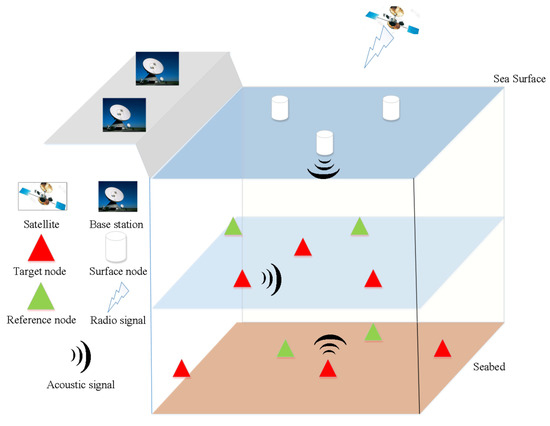 The ocean is vast, covering 140 million square miles, some 72 percent of the Earth’s surface, one of the most valuable natural resources that attract people to explore [1]. As an efficient tool for exploration, underwater wireless sensor networks (UWSNs) have played a pivotal role in a vast number of scientific or commercial missions in civilian and military applications [2,3,4,5,6,7]. It is worth noting that the data collected by sensors are meaningful only when the latter are geo-referenced [8]. However, it is infeasible to obtain the location information because traditional localization methods that rely on GPS techniques cannot be utilized in the underwater environment [9]. In this context, the message interaction, usually using acoustic communications, between surface nodes (or other reference nodes with known locations) and the submerged target must be carried out for localization [10]. The general system architecture of UWSNs is shown in Figure 1. With the knowledge of some internode distances (ranges), the targets’ position would be determined, and thus a considerable body of research has been investigated in the literature regarding localization in UWSNs [4,6,7,8,10,11,12,13,14,15,16,17,18,19,20,21,22,23,24,25,26].