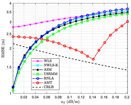 The RMSE versus variable is depicted in Figure 5. In addition to the fixed parameters in Table 2, the rest of the parameters in the scenario with variable are shown in Table 3. It is noteworthy that the frequency that the acoustic system operates varies from 10 kHz to 1000 kHz [26], where the corresponding could be 0.001 dB/m to 0.32 dB/m [27]. However, we only conduct the simulation with varying from 0.001 dB/m to 0.2 dB/m, which is more practical for UWSNs to operate [13]. In addition, it should be noted that the maximum of the absorption could be known because the side length of the cube is determined according to Figure 3 if , i.e., . Theoretically, the increase of accelerate the signal attenuation caused by the absorption, according to Equation (1). Therefore, it can be seen from Figure 5 that the performance of the methods, including WLS, NWLS-K, ASM, USRMM, and RNLA, deteriorates over the rise in . On the contrary, the performance of the proposed method (AMT) is inverse proportion to the rise in from 0.001 dB/m to 0.14 dB/m, and get close to the trend of CRLB. The outperformance of AMT can be explained to some extent by the fact that we mitigate the worst case of the absorption via a min–max strategy in the iteration. Nevertheless, it should be noted that if the bias exceeds the tolerance of the estimator, the performance of mitigation would degrade due to the limits of the bisection method. In other words, the performance of AMT would deteriorate if the absorption loss reaches a tolerant value. As shown in Figure 5, the tolerance is . In addition, we can observe that when , the error of AMT is more significant than most of the methods due to the intrinsic error of the estimator. When is relatively low, the absorption loss for AMT is relatively larger than the rest because we assume the worst situation (maximum distance between nodes). Fortunately, the error could be reduced when increases via iteration. Similarly, the same situation comes to CRLB when . The localization accuracy of CRLB is relatively lower than that of some considered methods due to the intrinsic error when is low. Although the rate of deterioration of AMT is larger than the rest when , the performance of AMT is better than the rest.