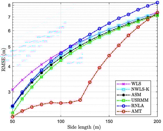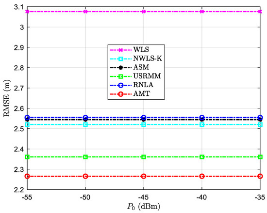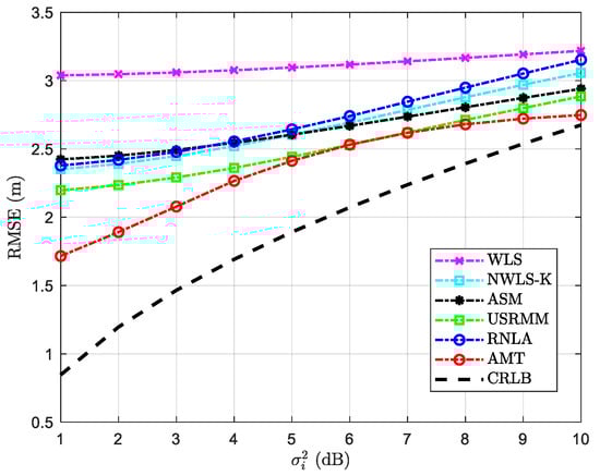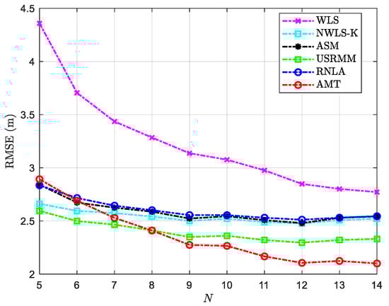 The RMSE versus variable is depicted in Figure 8. In addition to the fixed parameters in Table 2, the rest of the parameters in the scenario with variable are shown in Table 6. It can be seen that the considered algorithm is robust to , and the performance has relative stability. From Figure 8, we could see that similar results are performed for RNLA, ASM, and NWLS-K, of which the localization error is around 2.5 m compared with that of 3.1 m for WLS. It is obvious that the deviation of AMT is the lowest among them, albeit the difference between AMT and USRMM is small (almost 0.1 m).