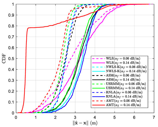 Figure 10 shows the cumulative distribution function (CDF) of for different algorithms when , respectively. In addition to the fixed parameters in Table 2, the rest of parameters are shown in Table 8. From Figure 10, we could see that AMT achieves at almost 80% when , whereas USRMM, NWLS-K, RNLA, ASM, and WLS achieve , , , , and at the same probability, respectively. The situation gets worse when it comes to , where, except for AMT, the methods achieve the same probability at more significant error than that of , i.e., for USRMM, for NWLS-K, for RNLA, for ASM, and for WLS. Regarding AMT, the adverse impact of the absorption seems to be mitigated in a way due to the min–max strategy that we minimized the worst situation, and the performance is improved to at almost 80%.