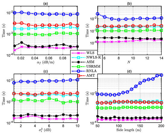 In addition to the RMSE, the computational time is another crucial factor for an estimator, which could intuitively reflect the efficiency of an algorithm. In this context, the simulation with subject to the computational time is carried out in different scenarios, and the results are depicted in Figure 11. The corresponding parameters in Figure 11 are (1) referred to in Table 2 and Table 3 for Figure 11a; (2) referred to in Table 2 and Table 5 for Figure 11b; (3) referred to in Table 2 and Table 4 for Figure 11c; and (4) referred to in Table 2 and Table 7 for Figure 11d. We could see that the time consumption of RNLA is much more than others. This is because a block prox-linear, the method to figure out the global solution, involves RNLA, which needs extra time for searching. Regarding the time consumption of AMT, the performance is not remarkable but acceptable, compared to that of RMSE. The average time consumption of AMT is around 2.7 × 10−3 s for each MCT, which is similar to that of NWLS-K but a little bit more than USRMM, ASM, and WLS.