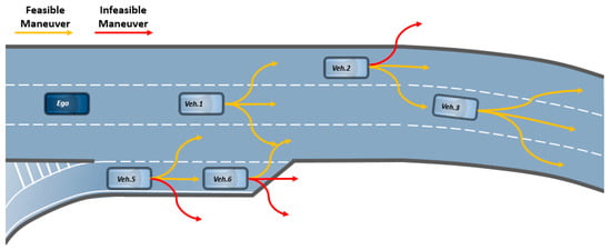 - Feasible maneuver vector for each lane: the simplest way to generate a feasible maneuver vector is the one-hot vector representing the possible maneuvers among LCL, LK, and LCR. For example, in the case of the first lane in Figure 3b, it is [0 1 1] because a vehicle can only execute LK and LCR owing to the road shape. However, it should be noted that any real values between 0 and 1 can be inputted.