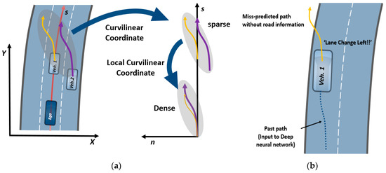 It is inevitable to collect a dataset by oneself for developing a deep-learning-based trajectory prediction algorithm. However, one has to face certain practical problems in this regard. Firstly, a dataset that covers the complete range of the sensor cannot be collected. For example, even if two vehicles shown in Figure 2a change lanes in an almost identical manner, they are perceived differently in the deep learning network because the measured position values of each vehicle are distributed differently. In short, this implies that we must collect a dataset which contains every maneuver that could happen within the entire range of the sensor. However, this requires an enormous amount of manpower and time. Secondly, it is realistically difficult to collect lane change (LC) trajectories because drivers do not frequently change their sane while driving on a highway. Therefore, a method of using the sparsely collected dataset appropriately should be considered. A graphical description and the expected result of such a dataset is shown in Figure 2a. Further, there could be a zigzagging motion of a vehicle in a real traffic situation, and this can sometimes cause the maneuver recognition network (MRN) to output an infeasible maneuver. However, an intelligent vehicle should be robust to such unlikely maneuvers of surrounding vehicles. Figure 2b shows a typical example. To mitigate these problems, we adopted the curvilinear coordinate system and lane assignment to represent the motion of a vehicle using HD maps. Consequently, this enables data-efficient learning and prediction of feasible future trajectories.