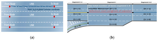 Extraction of road information. (a) HD maps contain nodes and links and each component is represented by points in the Cartesian coordinate system; (b) After extracting information via offline preprocessing, each segment has information corresponding to the segments such as B-spline parameters, lane information, length of the segment, and a feasible maneuver one-hot vector.