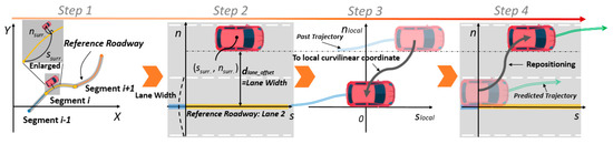 - Step 1: We assume the global position of an ego vehicle to be and obtain the relative states of the surrounding vehicles using GNSS-INS and LIDAR, respectively. Then, we obtain the global position of the surrounding vehicles. Next, we find the corresponding segment on which the surrounding vehicle is located by using the position values of the “From” and the “To” nodes. Here, we can search for it first within a range which spans from the back to the front of the segment of the ego vehicle;