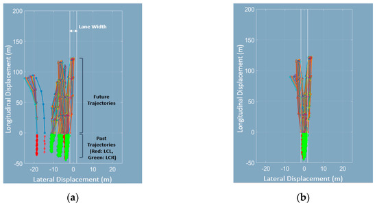 Brief results and the effectiveness of data processing are shown in Figure 6 below. We chose and visualized 200 arbitrary trajectories of lane change data. Figure 6a,b shows the results processed by Step 3 without lane assignment and Step 3 with lane assignment (i.e., in the local curvilinear coordinates), respectively. As can be seen from the figures, the data distribution in Figure 6b is compact. In addition, all the lateral displacements of the data in Figure 6a have negative values. This indicates that the trajectory prediction may fail if lane change occurs in the positive domain. On the contrary, Figure 6b shows concise lane change trajectories because all data are represented in the local curvilinear coordinates. With these data, the trajectory prediction network is able to learn the data more efficiently.