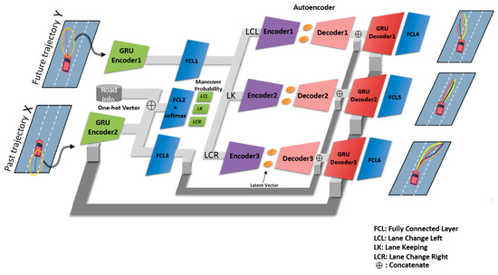 The trajectory prediction must have the ability to generate diverse trajectory samples, since different drivers have different driving characteristics, even if the driving maneuver is the same. Similar to other studies, our trajectory prediction network also adopts the generic encoder–decoder architecture with a VAE, but a slightly different structure. We have divided the prediction part into three VAE-GRU decoder networks to sample the trajectories which correspond to each maneuver (see the final outputs in Figure 7). GRU-encoder1 encodes the future trajectory, while VAE-encoders are learned to model an ideal distribution z, called a latent variable, to encode the future trajectory. The decoder generates diverse trajectories combined with the GRU-decoder, where its hidden states are connected to hidden states of the GRU-encoder2. Here, the ideal distribution z is modeled as a two-dimensional Gaussian distribution (i.e., z ~ ). Accordingly, in the inference phase, we remove the encoder parts of the VAE and generate a diverse future trajectory by sampling the variable z from the learned distribution. This sampled z passes through a decoder, and subsequently, the output of the decoder is concatenated with the encoded input feature. Finally, after passing through the last fully connected layer, we obtain the various trajectory samples (see the final output in Figure 7). Note that even though each of the encoder–decoder networks have the same structure, they do not share their parameters. To optimize this network, the trajectory prediction loss function is defined as follows