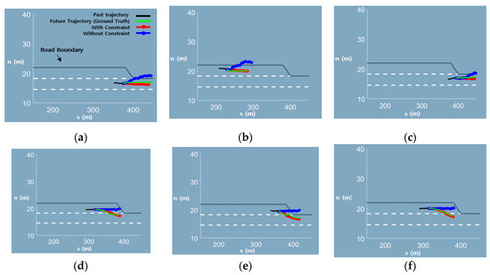 As shown in Table 4, the prediction result with the constraint is superior to that without any constraint. This indicates that it is reasonable to consider the road structure as a constraint because vehicles are affected by the road structure. Moreover, Figure 10 shows a representative critical scene. The result without the constraint corresponds to a realistically infeasible prediction. Nevertheless, vehicles cannot run outside the roadway. The network predicts that the vehicle is going through a road boundary. In addition, when the vehicle approaches the end of the merging section, it must merge into the freeway in the near future by changing lanes, even though vehicles seem to maintain their lanes. However, the network without a constraint cannot reflect this fact. In this case, the prediction result could cause a severe accident. On the contrary, the network with a constraint is aware of the road structure and thus can predict a reasonable trajectory. The networks never predict LCL as the most likely maneuver and predict LCR in advance at the end of the merging section.