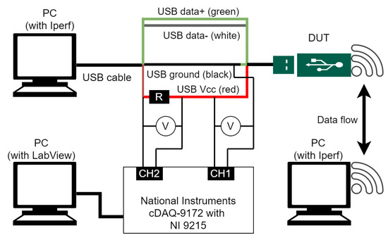 We first conducted the measurements of power consumption by using a number of off-the-shelf devices, which we used to define the generic power consumption model. The experiment stand shown in Figure 1 was built to measure the power consumed by each individual wireless transceiver. Three computers were used; two connected wirelessly through the measured WiFi dongle (IEEE 802.11g standard), and the third one used to measure power consumption of the tested dongle. The dongle was connected to a computer via a USB cable with a measurement bridge that allowed to directly measure voltage delivered to the USB stick (Channel 1—CH1 in Figure 1). Moreover, observation of the voltage on the shunt resistor of a known resistance (in this case 4.7 Ohms, denoted in the figure as R) allowed for the derivation of the current flowing in the WiFi dongle (Channel 2—CH2 in Figure 1). The National Instruments card NI 9215 was used to collect all measurements, and it was connected to a computer with LabView software operating on it. The traffic in the network was generated using Iperf software, allowing the setting of a precisely specified throughput in a network layer (using the UDP protocol). All measured devices are listed in Table 1 along with the utilized WiFi chipset. Please note that some devices from different vendors are based on the same chipset. We measured the power consumption as a function of average rate and distance/pathloss in both WiFi dongle states, i.e., transmitting or receiving data. We also tested the power consumption in idle (USB dongle connected, no wireless traffic) and associated states (modem connected to the network).