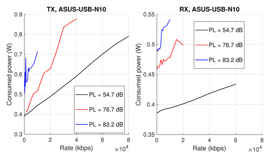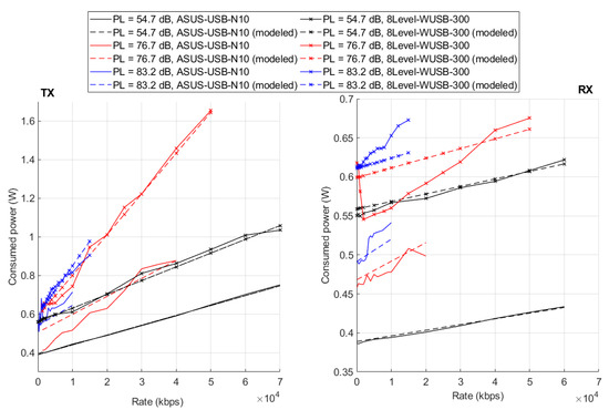 After the power measurements and the processing of collected data, we started creation of the power consumption model. Model fitting, statistical processing, and plots creation were done using Matlab. First, after the connection of the WiFi dongle to the computer, with no connection to any Access Point (AP) set, the model is in an idle state with power consumption modeled as a single positive number D. After association to the AP it is expected that the minimum power in the case of no IP transmission (no traffic in Layer 3) will be higher that D. The overhead will be denoted in our model by C being a non-negative number. When transmission begins the power increase is expected to be proportional to the transmission rate [7,8,9]. The power increase depends on the operation mode (receiving or transmitting mode). Typically, the transmitter (TX) mode power consumption will be dominated by the power consumed by a high-power power amplifier. On the receiver (RX) side, the reception algorithms appear to be the most power consuming. As such, the TX and RX rate’s influence on the consumed power is modeled separately. The utilized model for a single pathloss value is [4]: