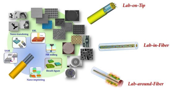 - Consales, M.; Pisco, M.; Cusano, A. Lab-on-fiber technology: A new avenue for optical nanosensors. Photonic Sens. 2012, 2, 289–314. [Google Scholar] [CrossRef]